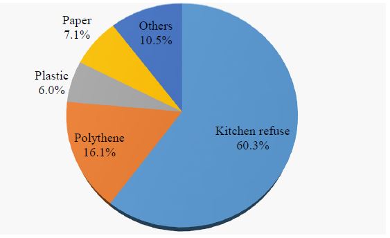 Most respondents (60.3%) reported decomposable waste as the main type generated, followed by polythene (16.1%) and plastics (6.0%). Industrial and medical waste was also reported, particularly among respondents near commercial and health facilities.