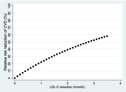 We used the results from the CTT collaboration and derived the following equation to calculate RRR for each individual patient, this dependent on the LDL-C reduction following treatment [35].
